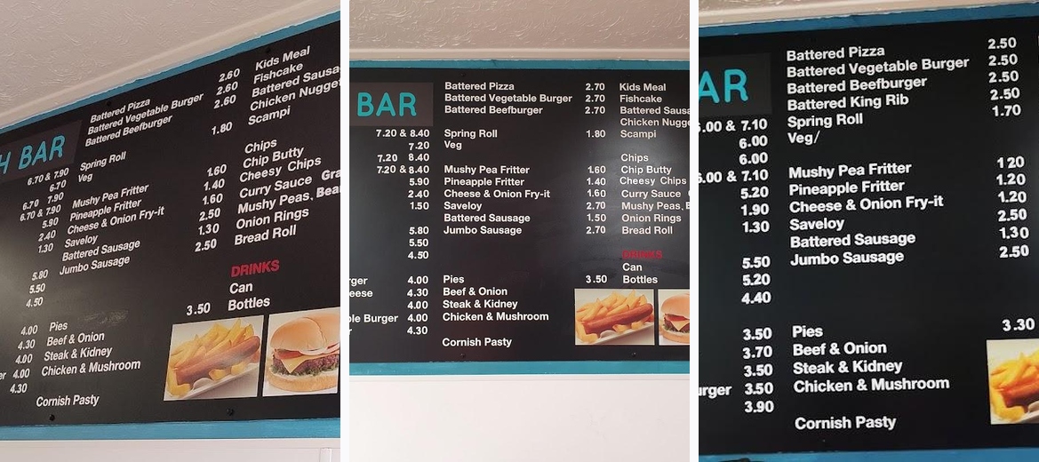 Vegetarian options stand out, with customers appreciating the veggie burger and spring rolls — a rarity in chippy offerings. The thoughtful inclusion of this menu caters to those who prefer plant-based meals.